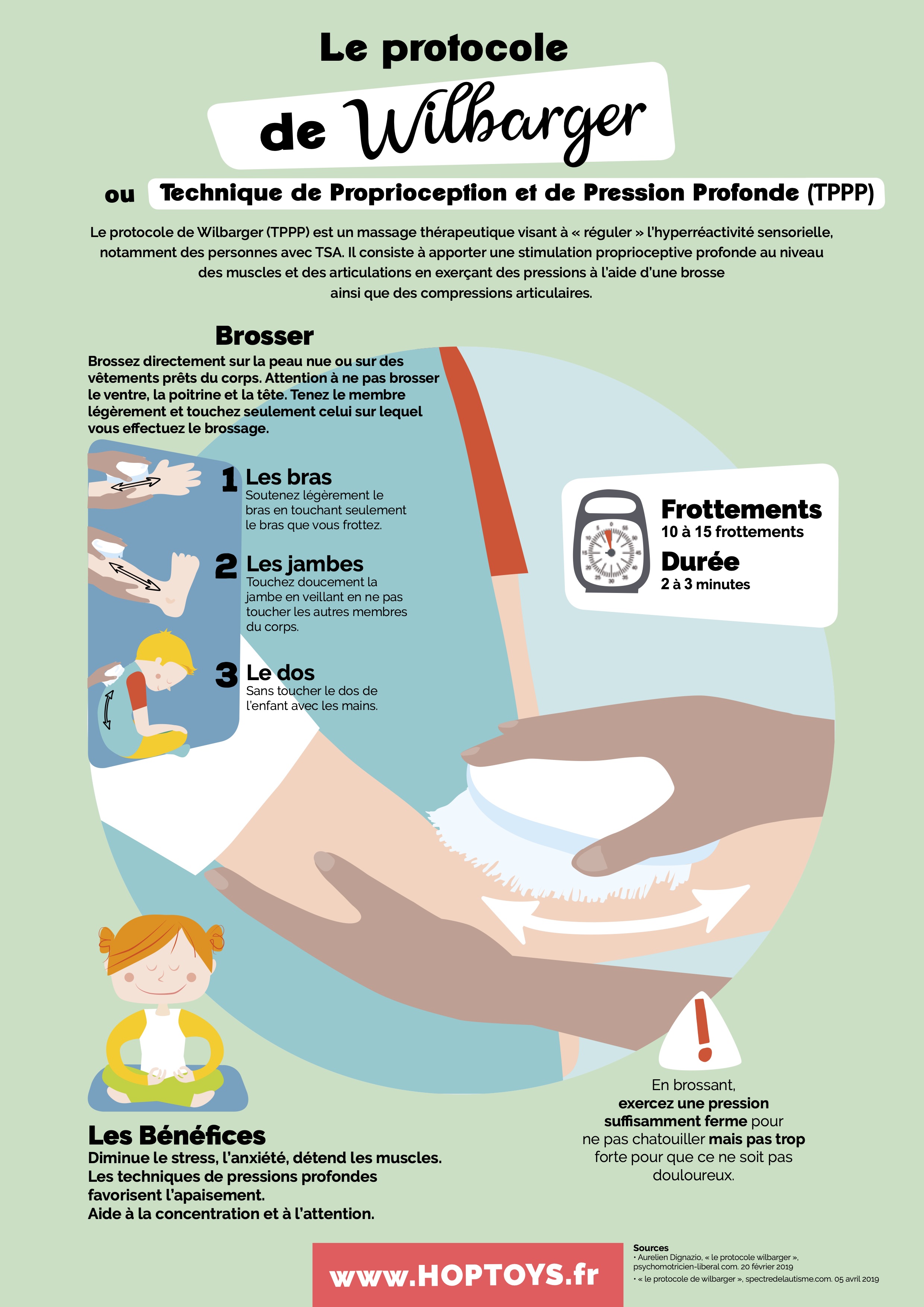 Ce protocole, créé par Patricia Wilbarger, occupationnal therapist et psychologue est surtout connu en France dans la prise en charge d’enfants autistes présentant des troubles sensoriels, plus particulièrement dans les cas d’hypersensibilité tactile afin d’en diminuer les comportements défensifs.